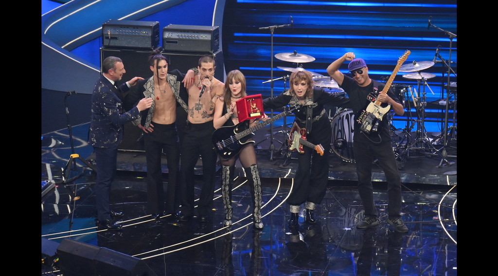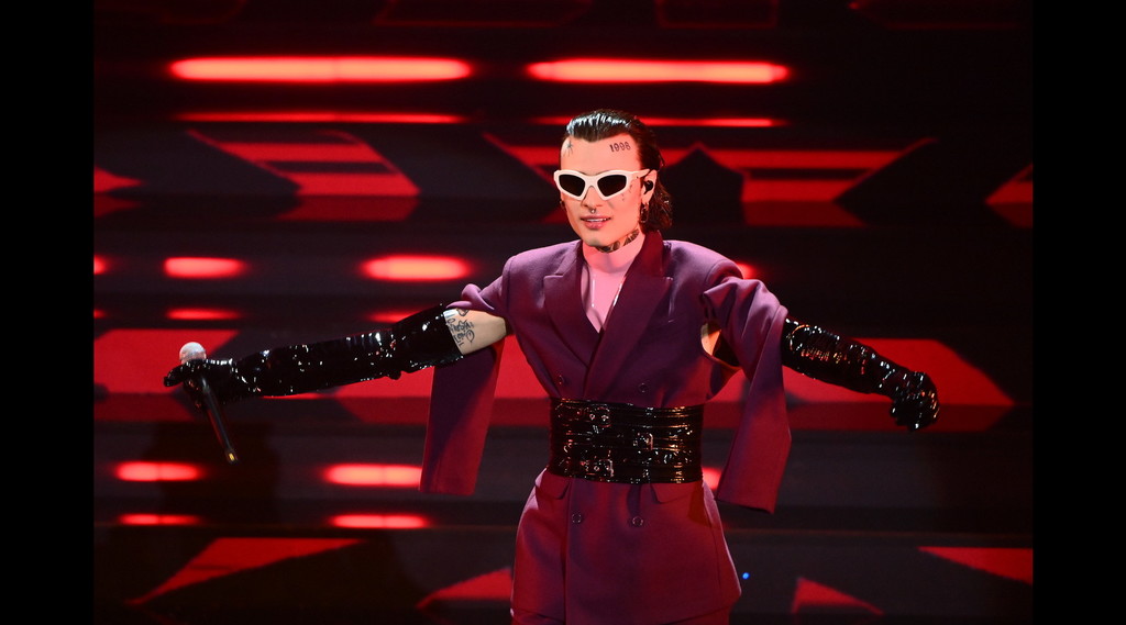 Maneskin: in completa armonia tra un nero ed un pitonato firmato Gucci, i 4 componenti della band, nella loro insolita semi-sobrietà, si differenziano molto nei look. A partire da Victoria che sceglie un body a dir poco “minimal” nelle dimensioni, con reggiseno pitonato, calza velata e stivali cuissardes neri in pelle alto con dettaglio frontale pitonato; per passare poi a Damiano, che propone invece un completo nero con pantalone a vita bassa e giacca cropped con revers pitonati. Sembrerebbe incredibile da dire, ma i Maneskin fanno rumore anche solo indossando un semplice completo. Ce li aspettavamo più osè? probabilmente si dati i loro look pregressi sul palco dell’Ariston, ma è evidente che la band porta con sè, e con i suoi outfit, una quantità indescrivile di energia.