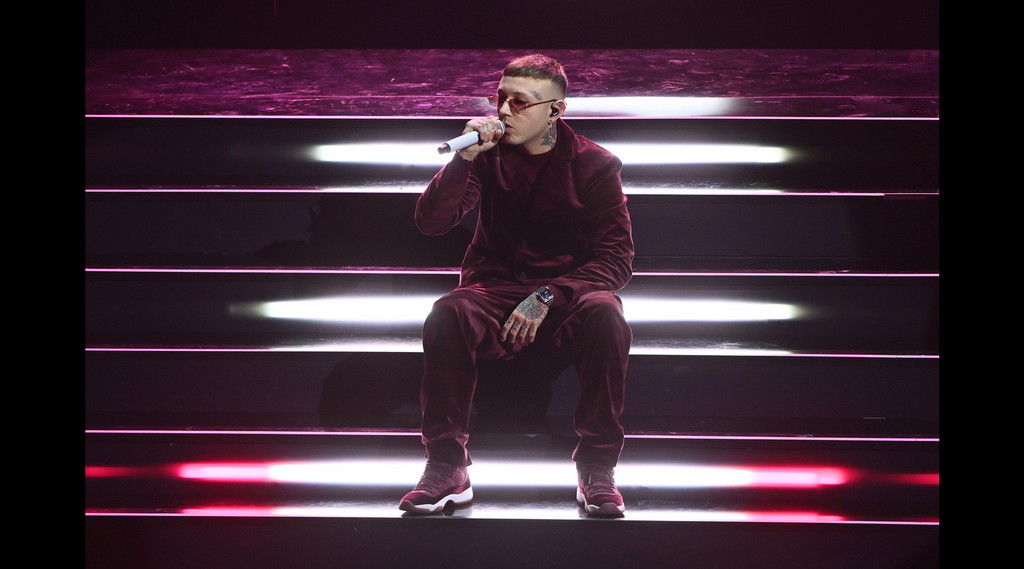 Rosa chemical: il rapper sceglie un completo color Vinaccia. Il Blazer con spalline ha il dettaglio della manica aperta. I guanti neri lunghi in pelle lucida riprendono il cintone stretto in vita, ma la vera chicca è il rosa big babol in lattice che spunta sul dolcevita sotto la giacca . Estroso, gioca molto con la moda, ma può fare ancora molto di più!