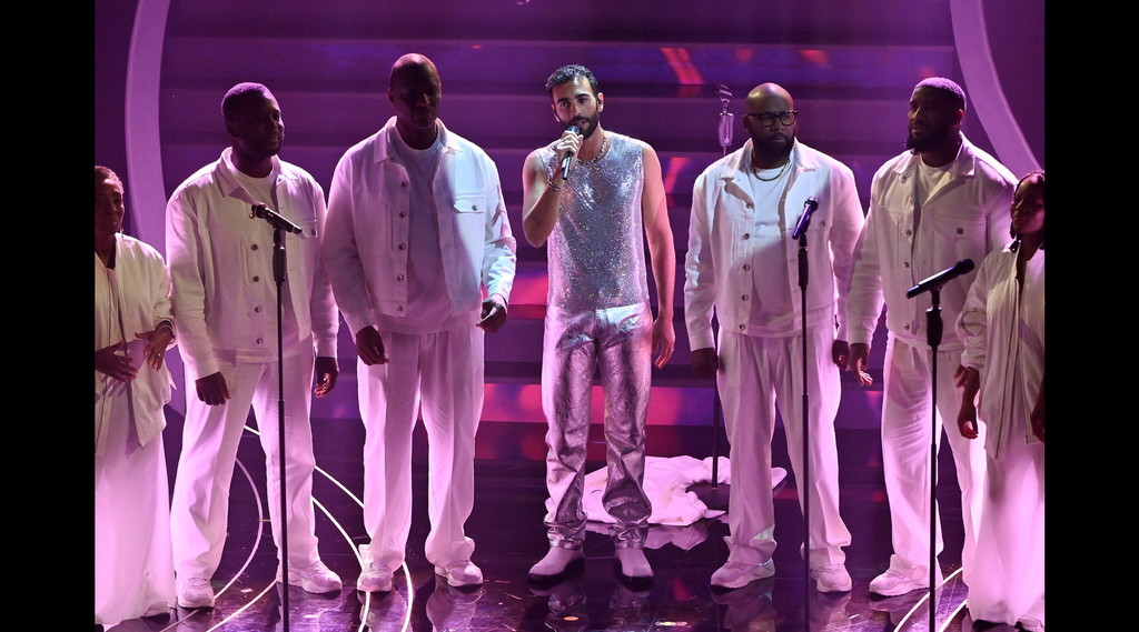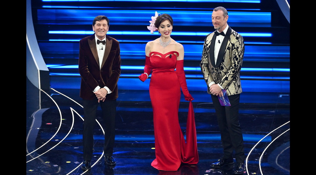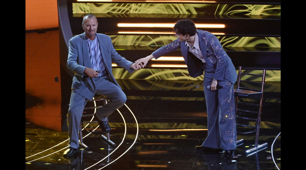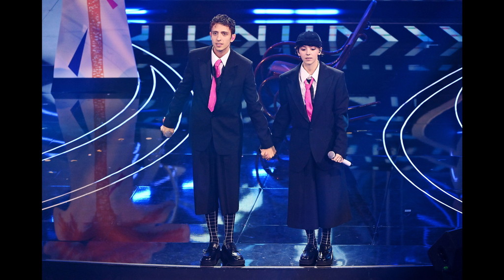 Tananai e Biagio Antonacci un duo inaspettato, la coppia sceglie un completo grigio. Tananai opta per una tonalità di grigio più scura, abbinata ad una camicia rosa cipria che riprende i ricami di strass luminosi del completo; dal suo canto, Biagio Antonacci indossa un completo in un grigio più chiaro, abbinato ad una camicia con scollo alla coreana, che riporta una fantasia sulle tonalità del grigio. Belli, freschi, inaspettati, energici!