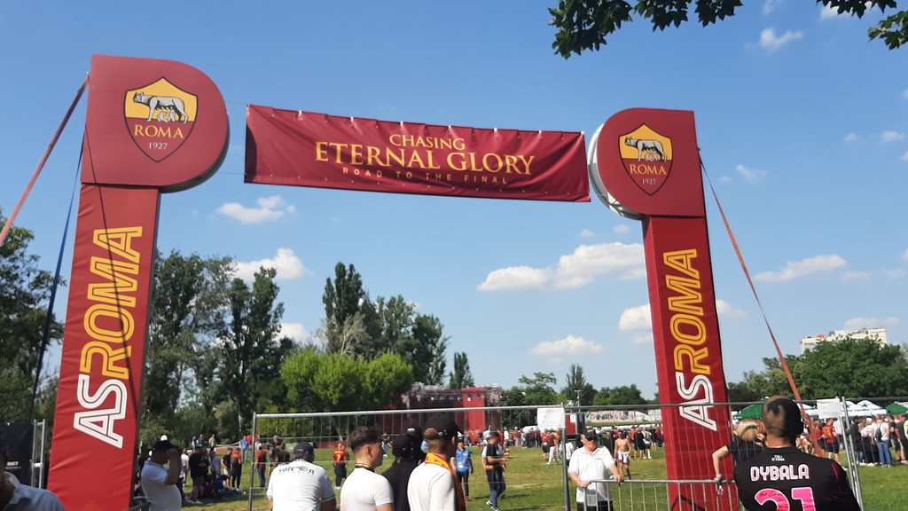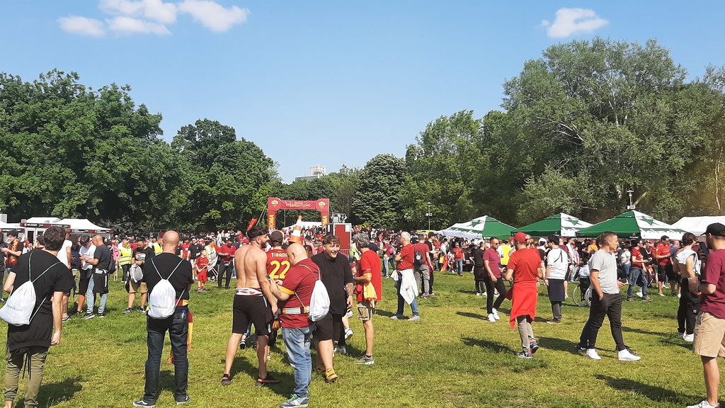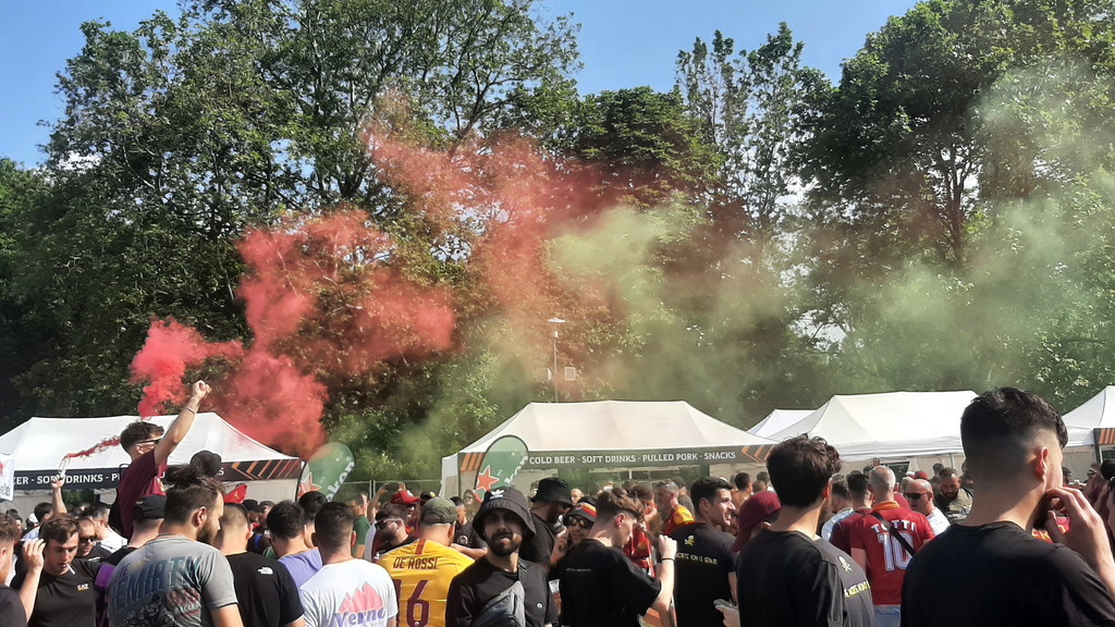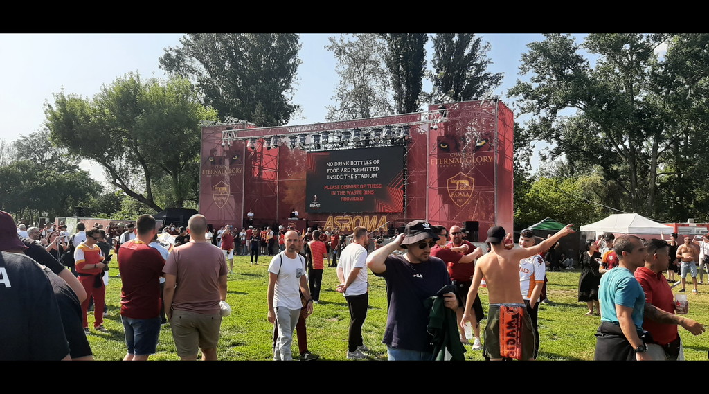 Prima di attendere il corteo che accompagnerà la squadra allo stadio, nella fan zone il saluto di tre vecchie glorie giallorosse: Ruggiero Rizzitelli, Marco Cassetti e Simone Perrotta. Pubblico in visibilio e inno della Roma cantato tra i fumogeni. La storica finale di Budapest si avvicina, e i tifosi si preparano per il grande evento.