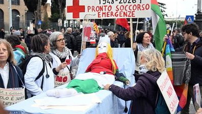 Referendum, al corteo per il No bambola raffigurante Giorgia Meloni sulla barella del pronto soccorso