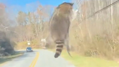 "Io posso volare". Il procione salta dalla macchina e spicca il volo