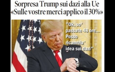 La vignetta di Osho sulla prima pagina de Il Tempo di domenica 13 luglio. Donald Trump colpisce duro. Dazi al 30% per l’Europa. Ora Ursula deve mediare. Entreranno in vigore dal primo agosto senza distinzioni. Il governo americano: “Non reagite, altrimenti tariffe più alte”. Von der Leyen: “Continuare a lavorare per un accordo equo”.