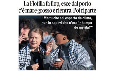 La vignetta di Osho sulla prima pagina de Il Tempo di martedì 2 settembre. Prima l’annuncio di retromarcia e poi la ripartenza in tarda serata. La Global Sumud Flotilla rientra al porto di Barcellona per il maltempo, dove resta ferma per diverse ore. Gli organizzatori della flotta, salpata domenica, parlano di decisione legata al mare grosso. Più di qualcuno, considerando l’ampia prevedibilità del meteo, dovuta alle nuove tecnologie, ritiene come la paventata decisione di fare un passo indietro, sia legata a possibili tempeste, ma ai timori dell’equipaggio dopo la chiara presa di posizione dell’esecutivo Netanyahu.