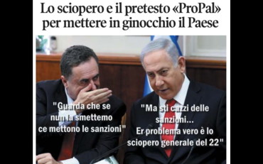 La vignetta di Osho sulla prima pagina de Il Tempo. Oggi lo sciopero generale promosso dai sindacati per fiancheggiare i ProPal. Coinvolte circa 80 piazze in tutta Italia. Stop a trasporti, scuola, sanità e fabbriche.