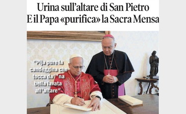 La vignetta di Osho sulla prima pagina de Il Tempo di martedì 14 ottobre. Lo scandaloso episodio avvenuto venerdì scorso, quando un uomo è riuscito a eludere la sicurezza e salire fin sopra l’altare della Confessione in San Pietro urinando sulla Sacra Mensa, ha avuto ieri l’epilogo liturgico da molti sperato. Papa Leone ha ordinato perentoriamente al cardinale Mauro Gambetti, arciprete della Basilica vaticana, di procedere a un solenne rito di riparazione per l’atto sacrilego.