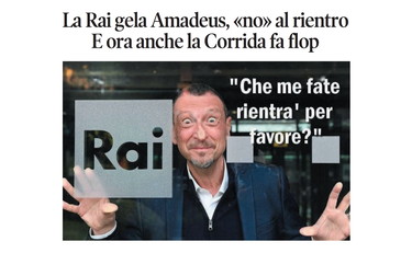La vignetta di Osho sulla prima pagina de Il Tempo di venerdì 19 dicembre. Amadeus è dato in partenza da Discovery visti i risultati deludenti ed era ritenuto prossimo a rientrare in Rai. Che però ha stroncato sul nascere ogni ipotesi in merito: «Pur ribadendo la stima professionale nei confronti del conduttore, Rai precisa che il suo ritorno non rientra nei piani editoriali dell’azienda» è stato il lapidario comunicato di Viale Mazzini. Il figliol prodigo che lasciò, per i lidi più economicamente vantaggiosi di Discovery, l’azienda che l’aveva portato al successo, non è gradito.