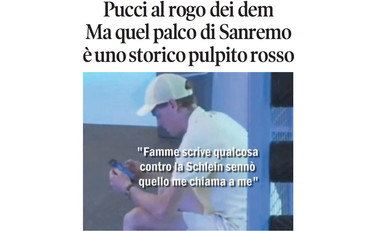 La vignetta di Osho sulla prima pagina de Il Tempo di lunedì 9 febbraio 2026. Andrea Pucci si ritira da Sanremo. Passo indietro del comico dopo gli insulti social e le proteste del Pd sulla sua presenza: «Clima d’odio contro di me». Meloni: «Deriva illiberale». Solidarietà anche da Salvini e Tajani. La Rai: «Clima di intolleranza e di violenza».