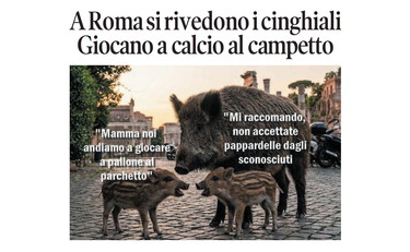 La vignetta di Osho sulla prima pagina de Il Tempo di giovedì 12 febbraio 2026. Èda un po’ che i cinghiali non si facevano rivedere in città. Eppure eccoli, immortalati in un video, "giocare" con una palla in un campetto di calcio di periferia. Gli esemplari che si vedono saltellare tra l’aria di rigore e il centrocampo possono sembrare innocui giocherelloni. Del resto, così come i loro cugini maiali, sono animali dotati di buona intelligenza; ma hanno anche grande forza fisica e sono ottimi ginnasti, capaci di accelerare da 0 a 50 km/h in un istante e compiere balzi verso l’alto, in corsa, fino a due metri. Il consiglio, dunque, se ci si dovesse trovarsi davanti a un campetto di periferia assediato dai cinghiali, è di non "giocacce contro", come si dice a Roma, perché la sconfitta è assicurata e potrebbe essere così cocente da dover ricorrere alle cure ospedaliere.