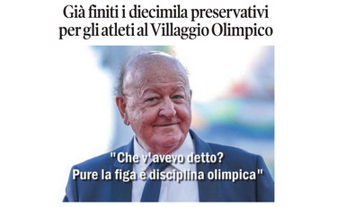 La vignetta di Osho sulla prima pagina de Il Tempo di sabato 14 febbraio 2026. Preservativi gratis esauriti alle Olimpiadi di Milano-Cortina 2026. È ormai consuetudine, sia durante i Giochi estivi che durante quelli invernali, fornirli, anche brandizzati con i cinque cerchi, nei villaggi olimpici; si tratta di un'usanza che ha preso piede nel 1988 ai Giochi estivi di Seul. In questa occasione, agli atleti di Cortina, sono bastati tre giorni per terminarli.