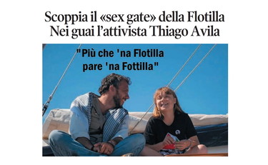 La vignetta di Osho sulla prima pagina de Il Tempo di lunedì 20 aprile 2026. Dal war movie alla commedia sexy in acque internazionali: un repentino cambio di genere. Altro che Flotilla, piuttosto un sequel di Love Boat, la famosissima serie americana a cavallo tra gli anni '70 e '80. Il velo viene impietosamente squarciato da un reportage del New York Post: la «Flotilla della libertà» di Greta Thunberg, partita domenica da Barcellona per un altro viaggio anti-Israele verso Gaza, è stata scossa da uno scandalo a luci rosse. In pratica, uno dei suoi leader «woke», il brasiliano Thiago Ávila, è stato accusato di «comportamento sessuale scorretto» a danno di almeno tre volontarie.