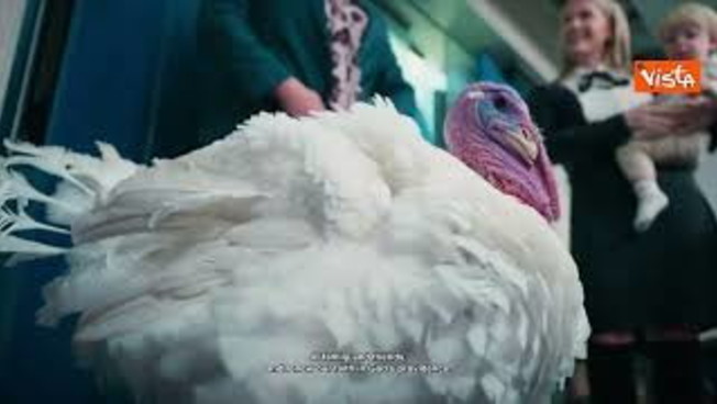 Il tacchino Waddle tra i cronisti alla Casa Bianca in posa per le foto prima della grazia di Trump
