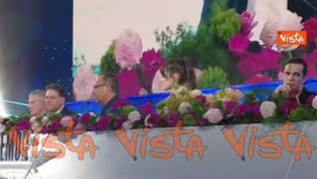 Irina Shayk arriva in Sala stampa, Conti l'aspetta con i fiori